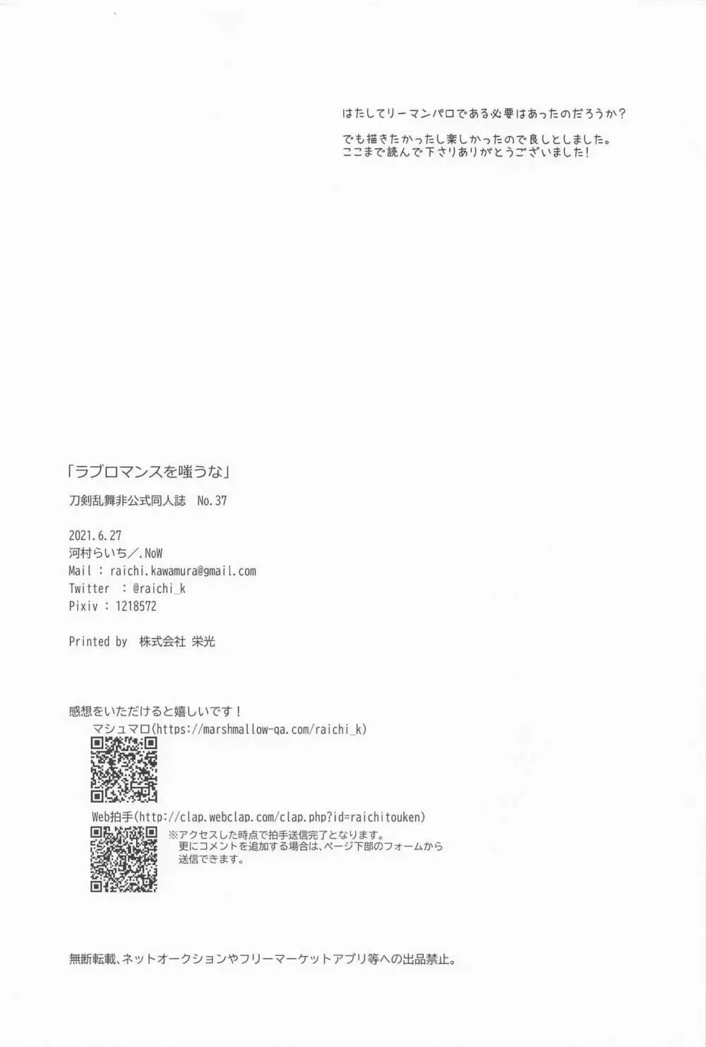 ラブロマンスを嗤うな 2025年5月26日 26ページ パロディ刀剣乱舞サークル.NoW作者河村らいち内容BL匂へし君と華燭を燈す JB2021 (まだ評価がありません)読み込み中... お気に入り0 みんなの感想 コメントをキャンセル 自分の名前を保存する 関連エロ漫画 くちびる ゆびさき さくらいろ 千羽の鶴 おどろきあんちえいじんぐ 二振目山姥切長義の苦悩 男性恐怖症のふたなり女審神者が粟田口刀剣に囲われるまで。 吸血鬼は美少年の精液しか吸わない ウマナミナノネ 鯰尾藤四郎折大隊 同田貫の嫌いな手入れ部屋でのくだらないお話。 愛して、それから 内番中 ~宝刀鶴丸の性欲処理当番~ 侵されたのは鶴 情人は月夜に斃れる 美酒元來 みっちゃんのハレンチアイスをおいしくなめる本 刀の価値とヒトの身の対価 夢からさめて じじとたぬきの成長記録 本当にあった本丸のエロい話 ひみつばこ