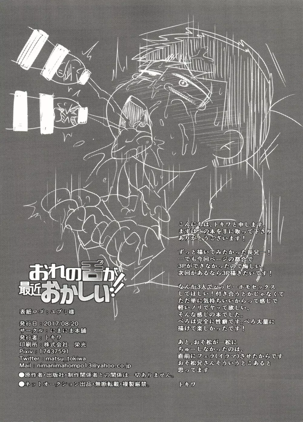 おれの舌が最近おかしい!! 2025年5月26日 32ページ パロディおそ松さんサークルにまにま本舗作者ときわ内容BL家宝は超寝て松 関西2017 (まだ評価がありません)読み込み中... お気に入り0 みんなの感想 コメントをキャンセル 自分の名前を保存する 関連エロ漫画 一カラ事変 『ネコになった一松が発情期なんだけど』 気持ちいい事は大体悪松兄さんから教わった あまえびたまご (牛乳) 我慢上等愛羅武勇 (おそ松さん) 【Web再録ノーマルカラ一R-18】COSPLAY PLAY 催眠 本音と建前 金がないなら体で払ってもらおうじゃねえかEXさん 14×1ストラクチャー Paraphilia よく分からない派生こぼれ話 天狗と猫又の子?育て本 jacobson error1 君のその身が朽ちたとて CHU CHUしませんか?? 帰宅部一松、演劇部のノリについていけない!! 今宵は誘って!!酔い松さん 触手×バルバトスデビおそ (6つ子の魂☆フォーエバー3) [眠れぬ舞台 (ののもの) トド松はいらない子 (おそ松さん) めでたしめでたし、とはいかないようで。 チョロ松警部が全裸で夜のお散歩・衆人環視の中××××しちゃうR18の本 四畳半の地獄にようこそ
