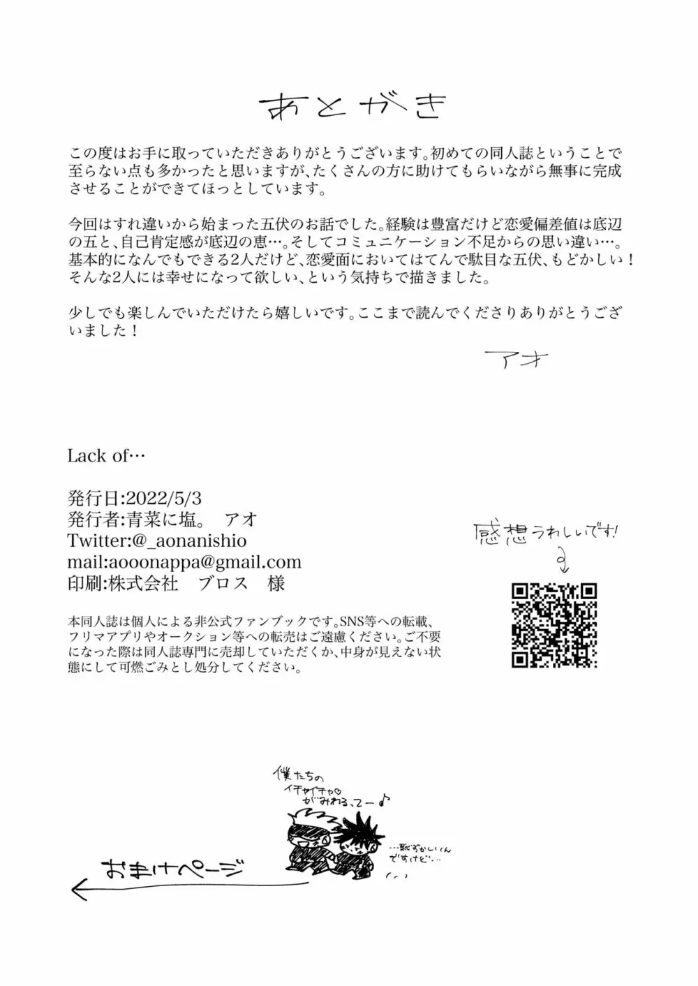 Lack of… 2025年5月26日 37ページ パロディ呪術廻戦サークル青菜に塩。作者あお内容BL男性専用キャラ五条 悟伏黒 恵 (まだ評価がありません)読み込み中... お気に入り0 みんなの感想 コメントをキャンセル 自分の名前を保存する 関連エロ漫画 ミルクパニック 初心 FUSHI TO NEKO 口ほどに物を言う 獣医さんは消防士さんに抱かれたい 境界線のむこうがわ words unsaid アオイハルのはしりかた 愛とか恋とか 奥手な先輩よくできました この想いを自覚してから 親友とスケベしたい いんもらりすと 夏五は現実なのでスキャンダルNGです!!! Mugenno Sakini Itarumade バカになる程恋に溺れ ノー・ワン・ナイト・スタンド 私の相方がかわいい! 死してなお愛は泡沫 あさがくるまでここにいて
