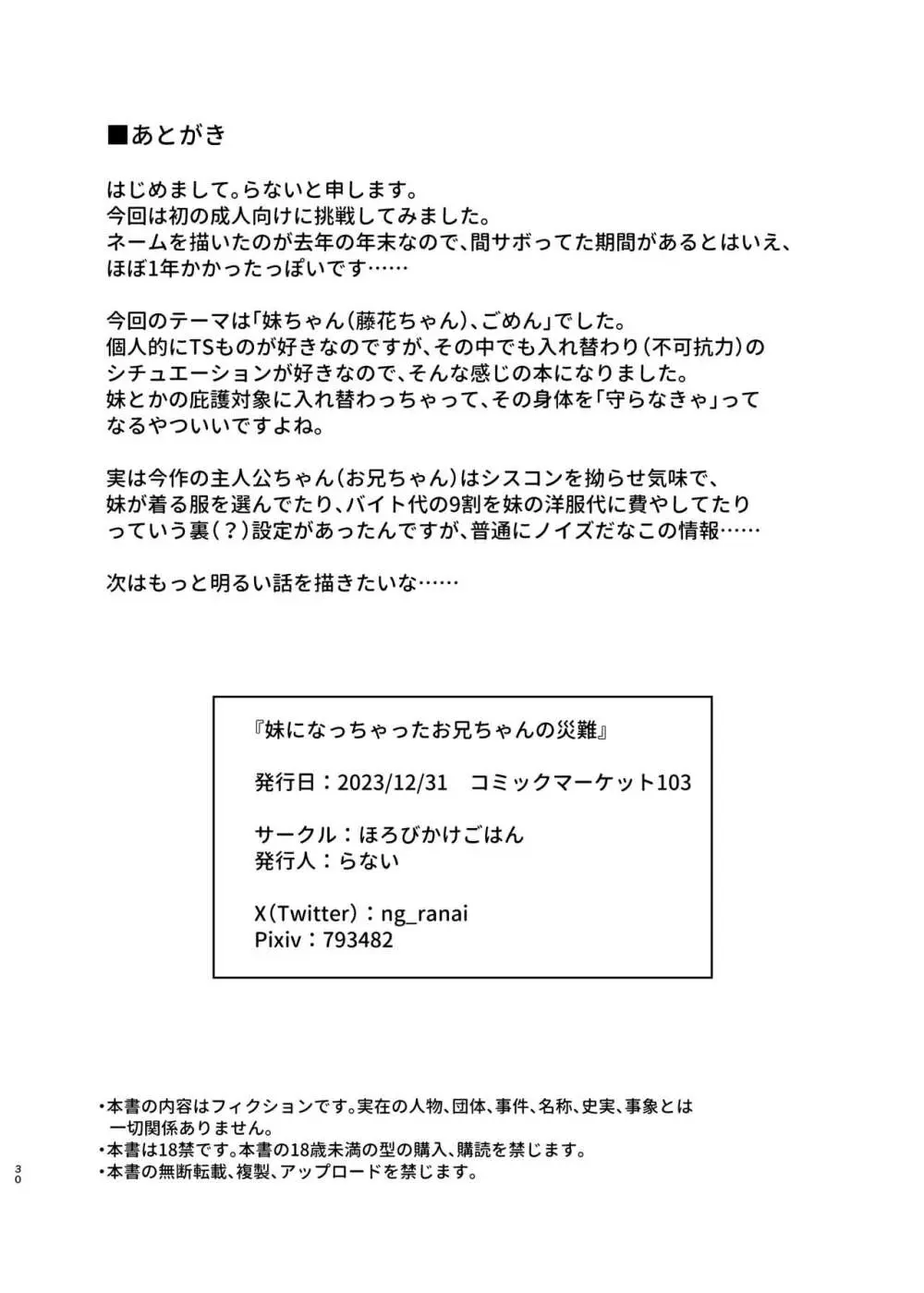 妹になっちゃったお兄ちゃんの災難 2025年5月25日 30ページ パロディオリジナルサークルほろびかけごはん作者らない内容confinementsole femalesole maleツインテールレイプロリコン入れ替わり処女喪失性転換精神崩壊 (まだ評価がありません)読み込み中... お気に入り0 みんなの感想 コメントをキャンセル 自分の名前を保存する 関連エロ漫画 関連記事が見つかりませんでした。