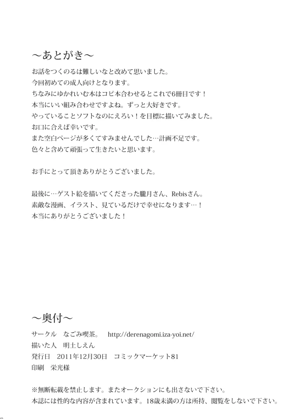 紫に染まる 2025年5月24日 50ページ パロディ東方Projectサークルなごみ喫茶。作者明土しえん内容C81百合・レズキャラreimu hakureiyukari yakumo (まだ評価がありません)読み込み中... お気に入り0 みんなの感想 コメントをキャンセル 自分の名前を保存する 関連エロ漫画 博麗春画事件 狐巫女 おなじですね La Tentacule 紫色の欲求不満 ホルスタイン早苗さん Sweet Captive 淫霊夢・博麗神社復興計画 首輪彼女 赤と紫が混ざる刻 文々ラプソディ [有限産業すきま風 (探検はらはら)] れーむがまりさとゆかりにとられっこするほん (東方Project)) [DL版] 博麗神社で診察ちゅう ゆかれいむでスキマックス 東方アヘ顔合同 ICE FLOWER れーむとまりさがひたすらちゅーするだけで終わらないほん。 藍様と紫様があたため合うだけのお話 ゆかりんの緊縛愛ゆかりんの緊縛愛撫で静かにイかされまくる霊夢さん PassioNail