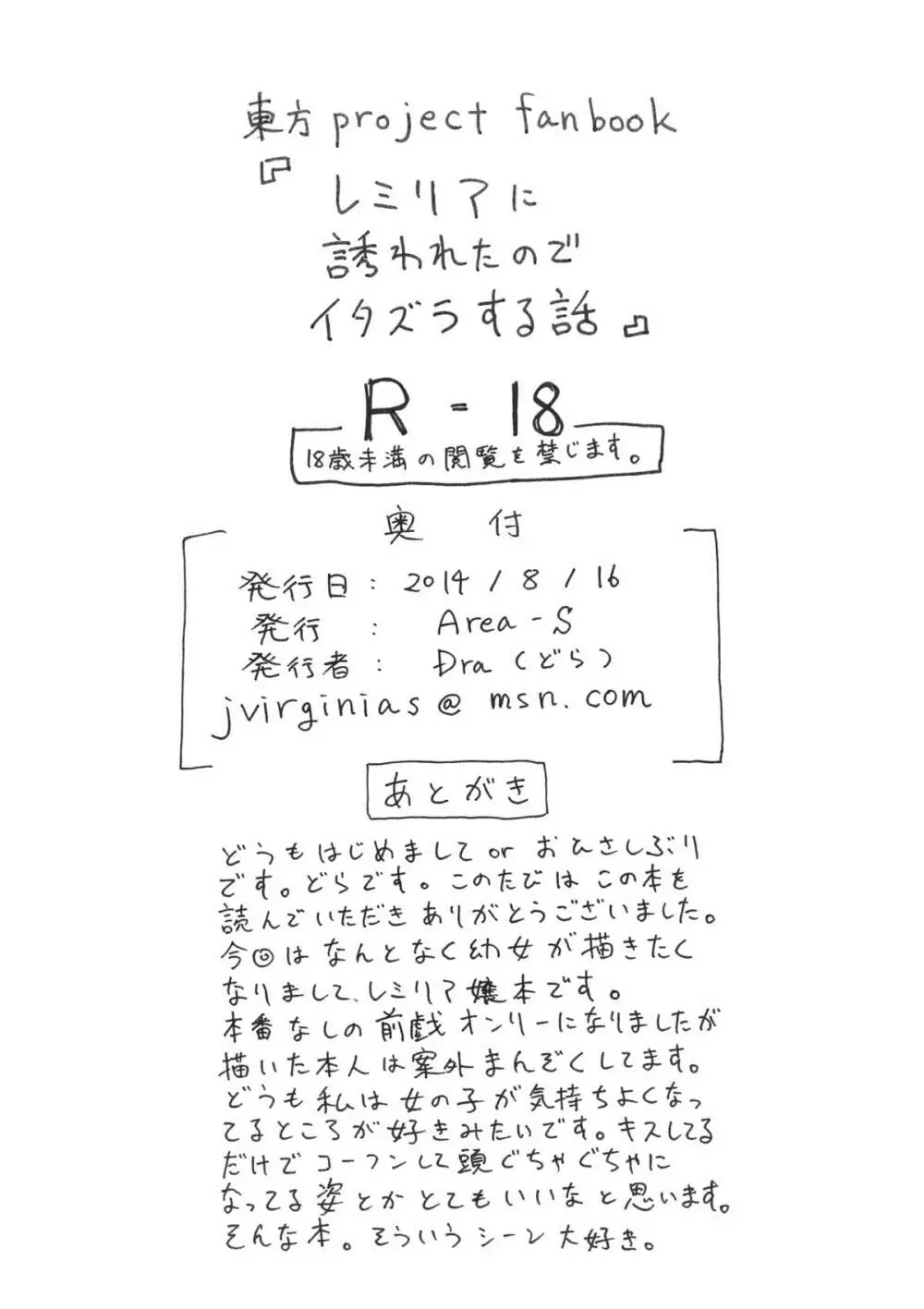 レミリアに誘われたのでイタズラする本。 2025年5月22日 10ページ パロディ東方ProjectサークルArea-S作者Dra内容C86loliconwingsキャラremilia scarlet (まだ評価がありません)読み込み中... お気に入り0 みんなの感想 コメントをキャンセル 自分の名前を保存する 関連エロ漫画 究極反則2 紅魔館艶行 吸血鬼の保健体育 CHAIN MSGKWR -ScarletBunny- 絶対君主グングニル フランちゃんはみんなとスライムであそびたいそうです レミ妊 レミリアお嬢様にイケないコトする本 雨夜月 幻想郷攻略作戦 咲夜・レミリア・フラン編 かっこにじゅういち ‐迷える羊たち‐ scarlet dezire Provocative gesture さんむすがあらわれた! 紅い月夜にささやいて 究極反則 レミフラの精液大好き祭 濡れる紅魔館 おくすりれみりあ!