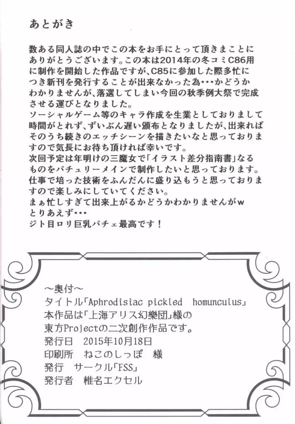 Aphrodisiac Pickled Homunculus 2025年5月22日 34ページ パロディ東方ProjectサークルFSS作者椎名エクセル内容巨乳秋季例大祭2キャラパチュリー・ノーレッジ森近 霖之助河城 にとり (まだ評価がありません)読み込み中... お気に入り0 みんなの感想 コメントをキャンセル 自分の名前を保存する 関連エロ漫画 煌盾装騎エルセイン Vol.4 「Aphrodisiac Plague Sequelae」 Homunculus Logistics Aphrodisiac Plague Sequalea Unlimited aphrodisiac works Aphrodisiac Obedience Aphrodisiac 煌盾装騎エルセイン Vol.4 「Aphrodisiac Plague Sequelae」 煌盾装騎エルセイン Vol.3 「Aphrodisiac Plague」 WHITE-APHRODISIAC aphrodisiac aphrodisiac xxx ~媚薬で感じるエクスタシー~ APHRODISIAC