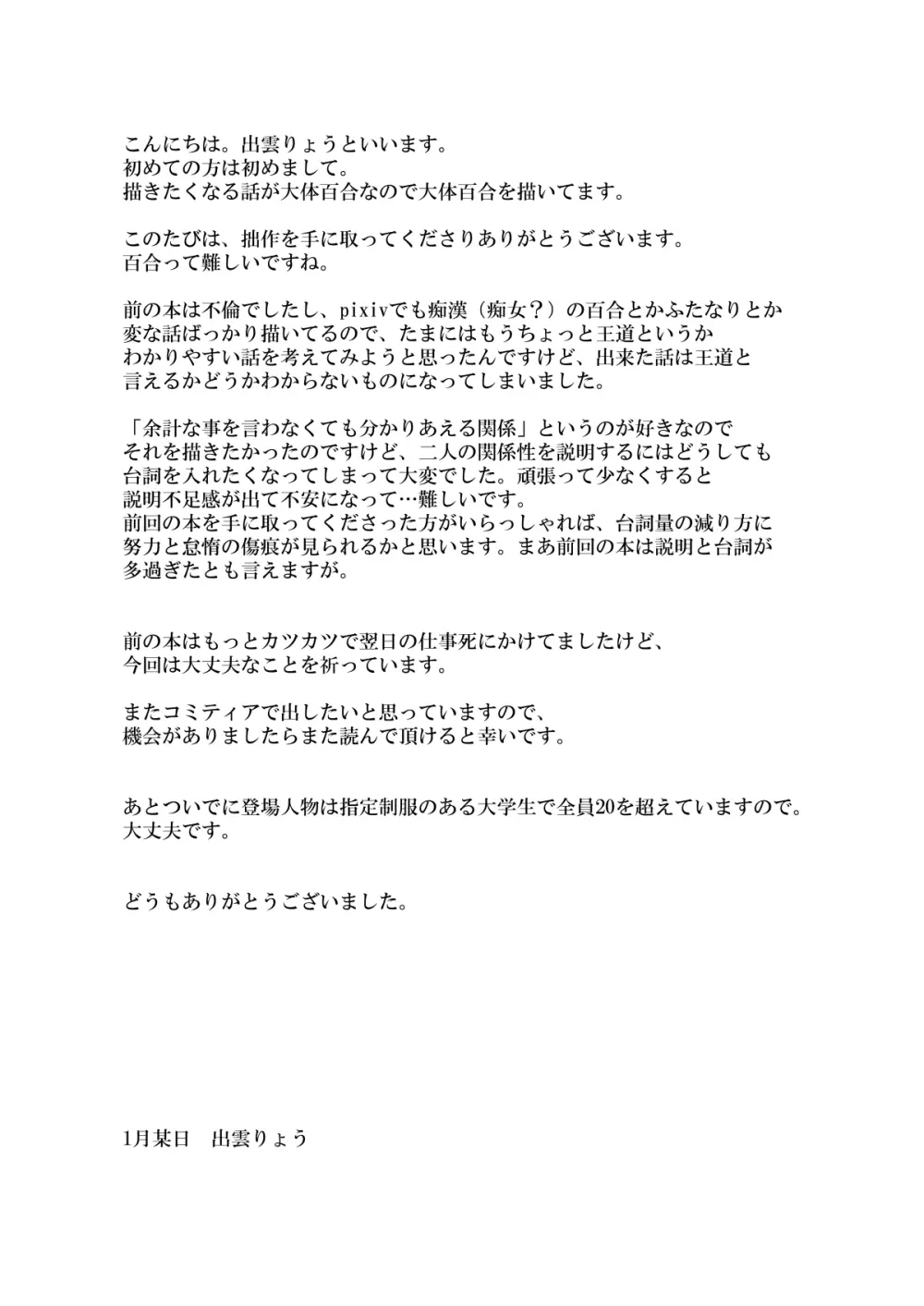Smoke With You 2025年5月27日 18ページ サークル秘話出雲大社作者出雲出雲りょう内容multi-work seriesyuri女子高生の制服女性のみ眼鏡 (まだ評価がありません)読み込み中... お気に入り0 みんなの感想 コメントをキャンセル 自分の名前を保存する