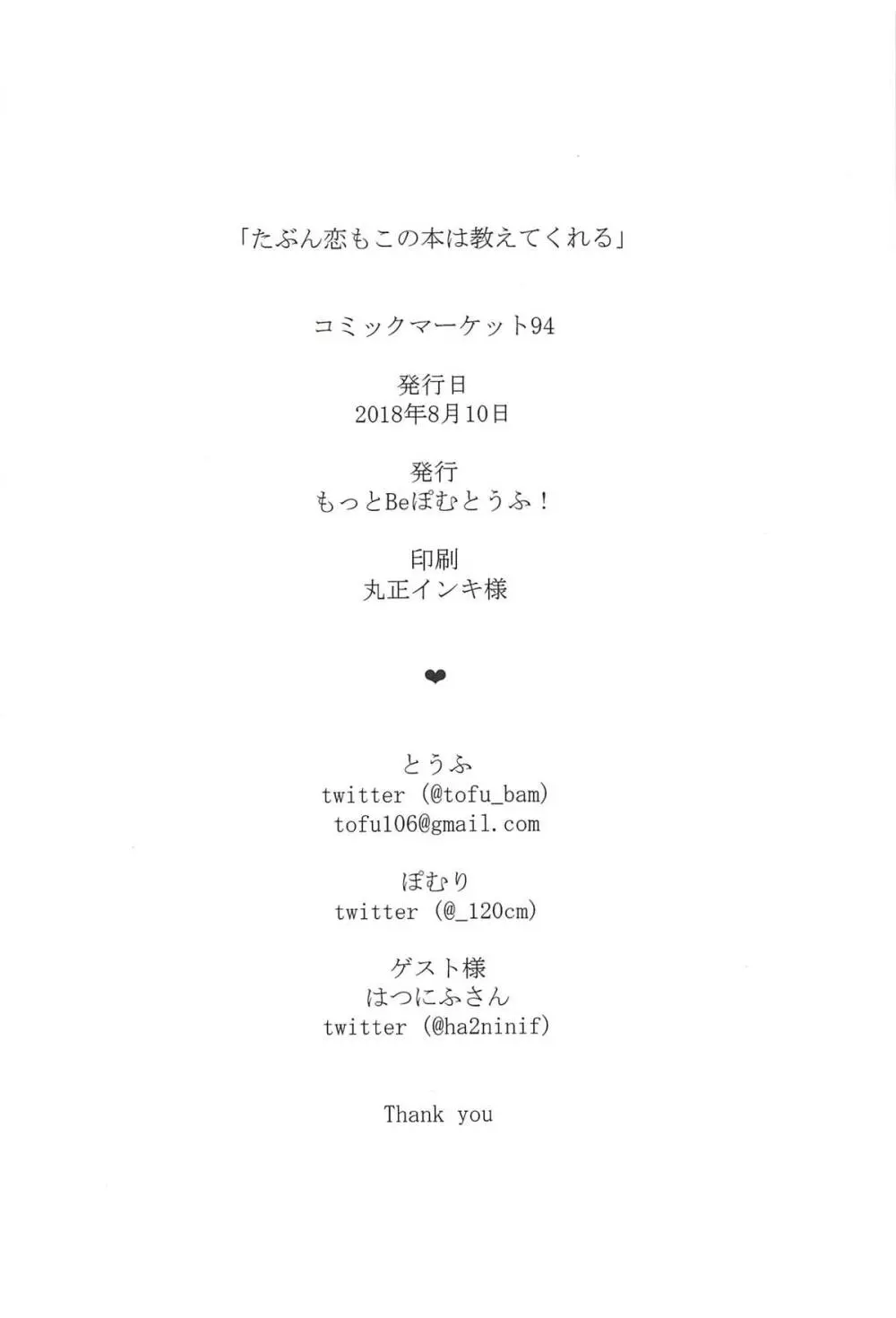 たぶん恋もこの本は教えてくれる 2025年5月27日 30ページ パロディオルタナティブガールズサークルもっとBeぽむとうふ!作者とうふぽむり内容C94sole femalesole male (まだ評価がありません)読み込み中... お気に入り0 みんなの感想 コメントをキャンセル 自分の名前を保存する